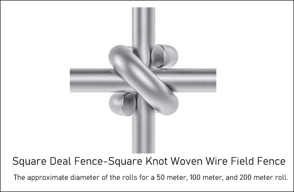 Square Deal Fence, the knot and end wraps type for customers in New Zealand. The approximate diameter of the rolls for a 50 meter, 100 meter, and 200 meter roll.