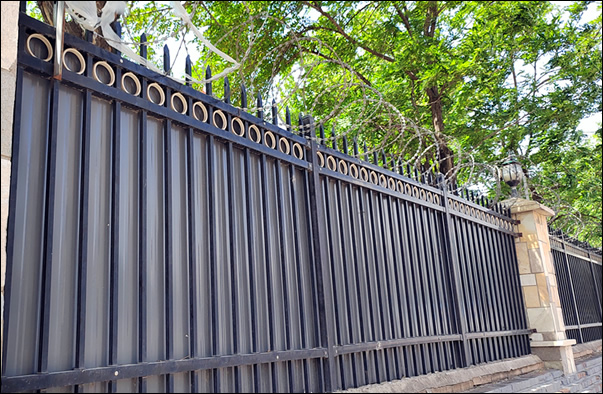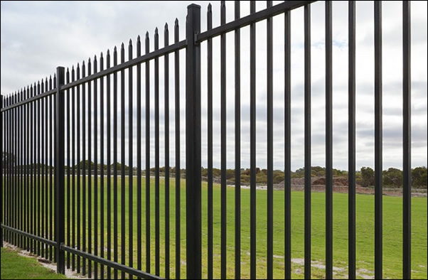Palisade Fence – designed to provide protection with sharp pointed tops, with vertical pales in varying heights and spacings, galvanized and powder coated for extra protection.